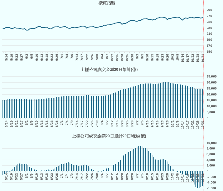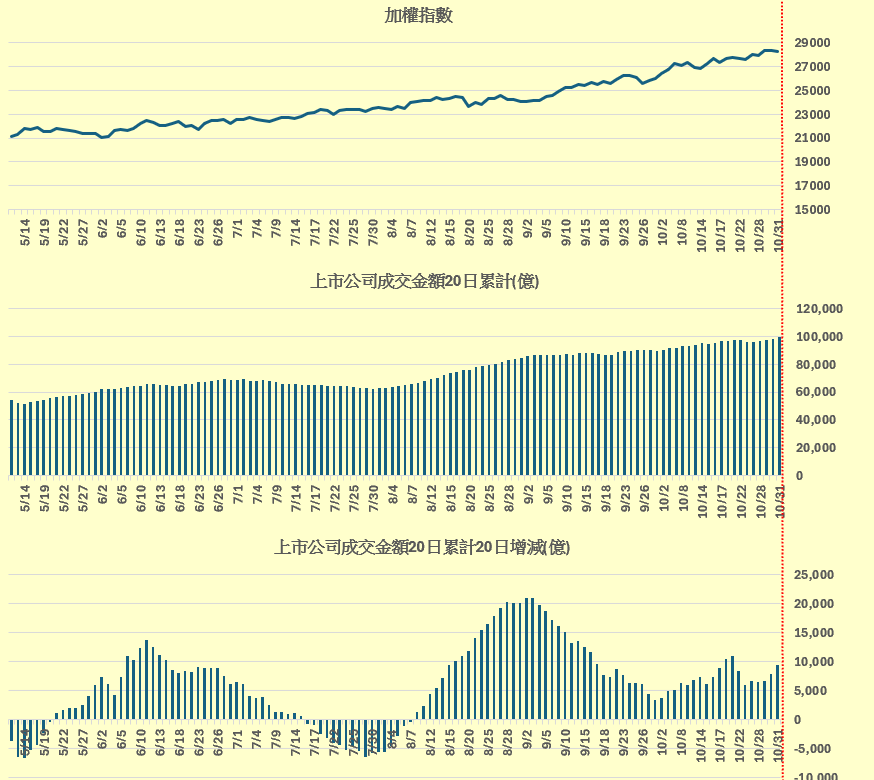 加權指數 vs 上市公司成交金額20日累計 vs 上市公司成交金額20日累計20日增減