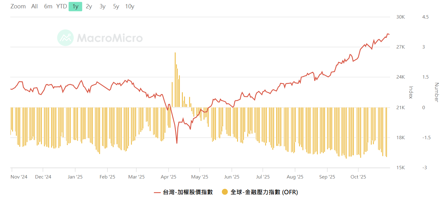 全球金融壓力指數vs加權,資料來源:MacroMicro 財經M平方,留意壓力指數從低點開始往上攀升