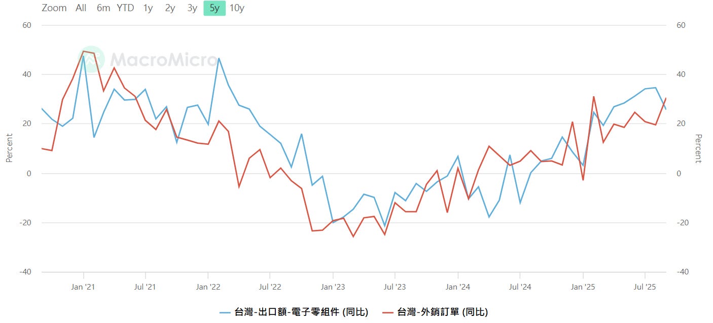 台灣-電子零組件出口(年增率) ,台灣-外銷訂單(年增率)注意高低點極值(-10~+20),資料來源:MacroMicro 財經M平方,SimonShih,財經雷說明