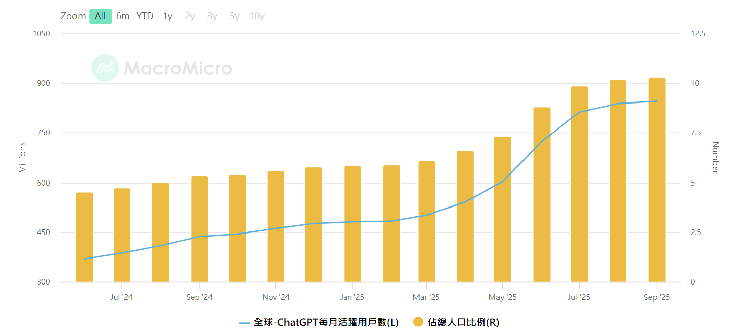 ChatGPT 每月活躍用戶數及佔比,資料來源 : MacroMicro 財經M平方