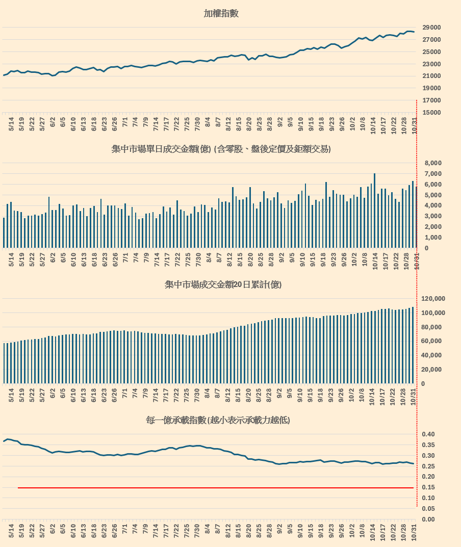 集中市場成交金額跟加權指數的對應。(留意每一億承載指數,越小表示承載力越低),概念來源 : 總大。