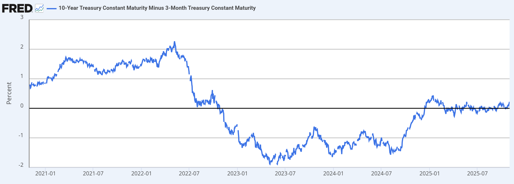 美10年債殖利率-3個月殖利率,資料來源:Fred