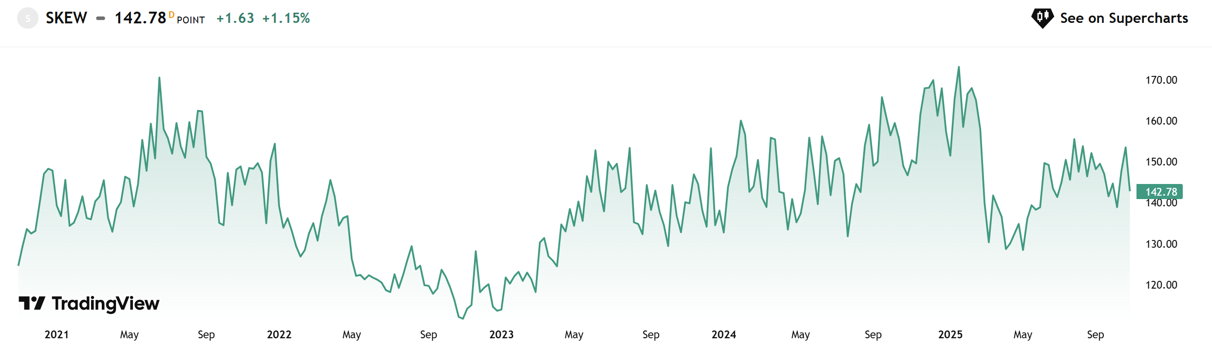 SKEW : 另一種風險-不是平均波動,而是「尾部風險」。它觀察的是深度價外(價外)把選擇權的溢價,當投資人特別害怕末端下跌時,他們會搶買這些保險,導致價格比平價權選擇更貴。這種價格差異反映在SKEW上,可視為市場對「黑天鵝」事件的警覺程度。VIX 可能在低點時,SKEW 卻在高檔。這表示市場表面平靜、但對潛在災難已高度戒備。這也解釋了為何很多「崩盤前夕」的圖表,VIX 尚未暴衝,但 SKEW 已經先升,資料來源 : tradingview